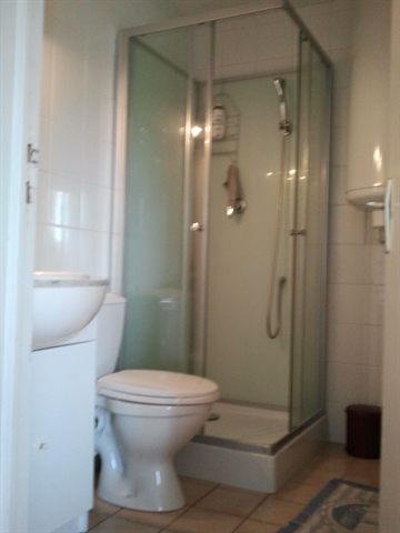 La salle de bain dispose d'un lavabo et d'une douche. Machine à laver et wc complètent l'équipement de cette pièce