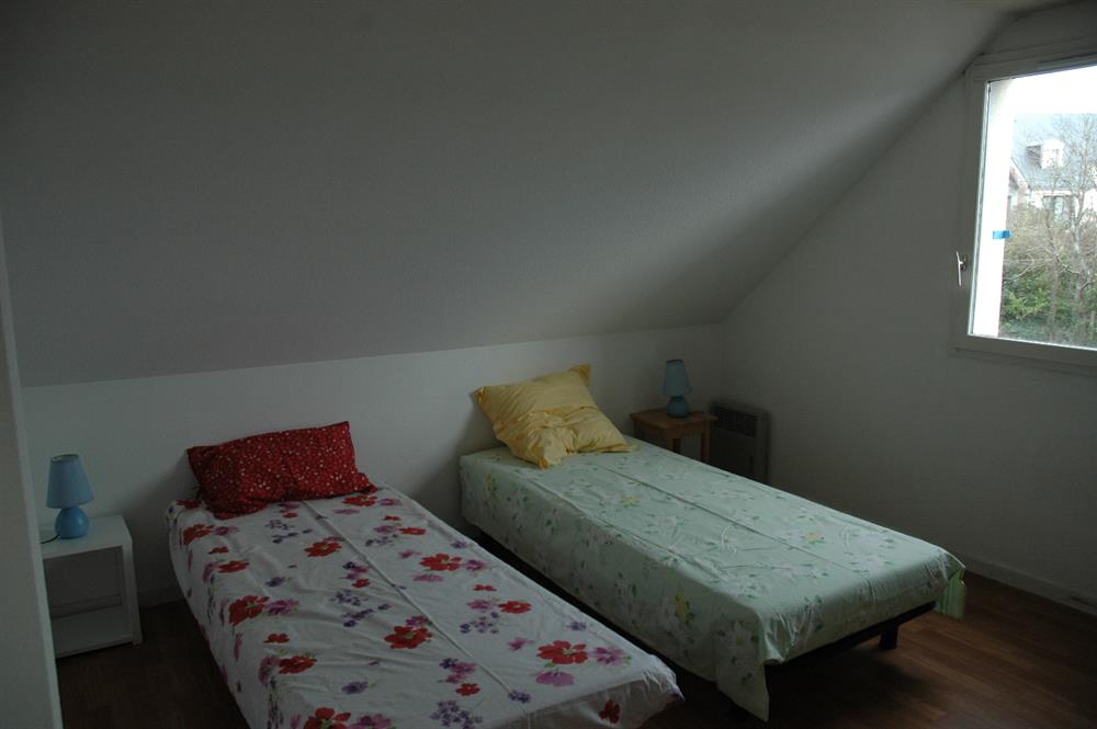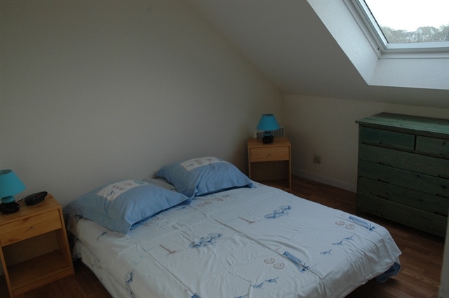 Les deux chambres sont à l'étage. La première, dont la fenêtre donne sur la campagne, est composée de deux lits d'une personne. La deuxième chambre est meublée d'un lit 140. Par le vélux, la mer apparaît au-delà des toits de la résidence.