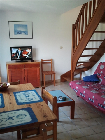 Au rez-de-chaussée, la pièce principale est meublée d'une table et de six chaises, un canapé (transformable en lit pour deux personnes), un meuble de rangement et une étagère (cafetière, boulloire, grille-pain à disposition).